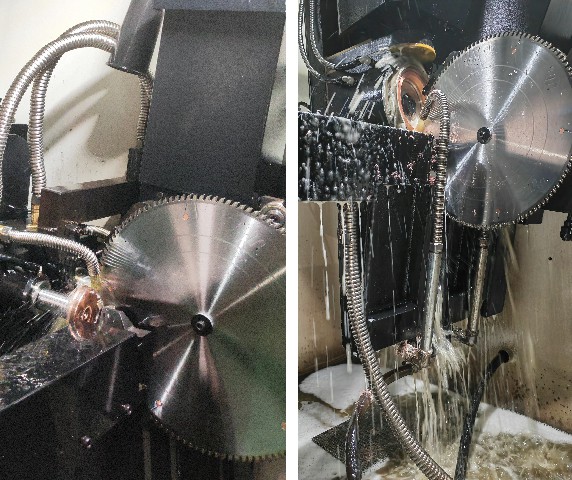 3. Manual/automatic sliding table expands the application space of the machine tool, which can not only process small saw blades, but also process large saw blades, realize the function of cutting in the turning process, and avoid short circuit of copper cutting.
