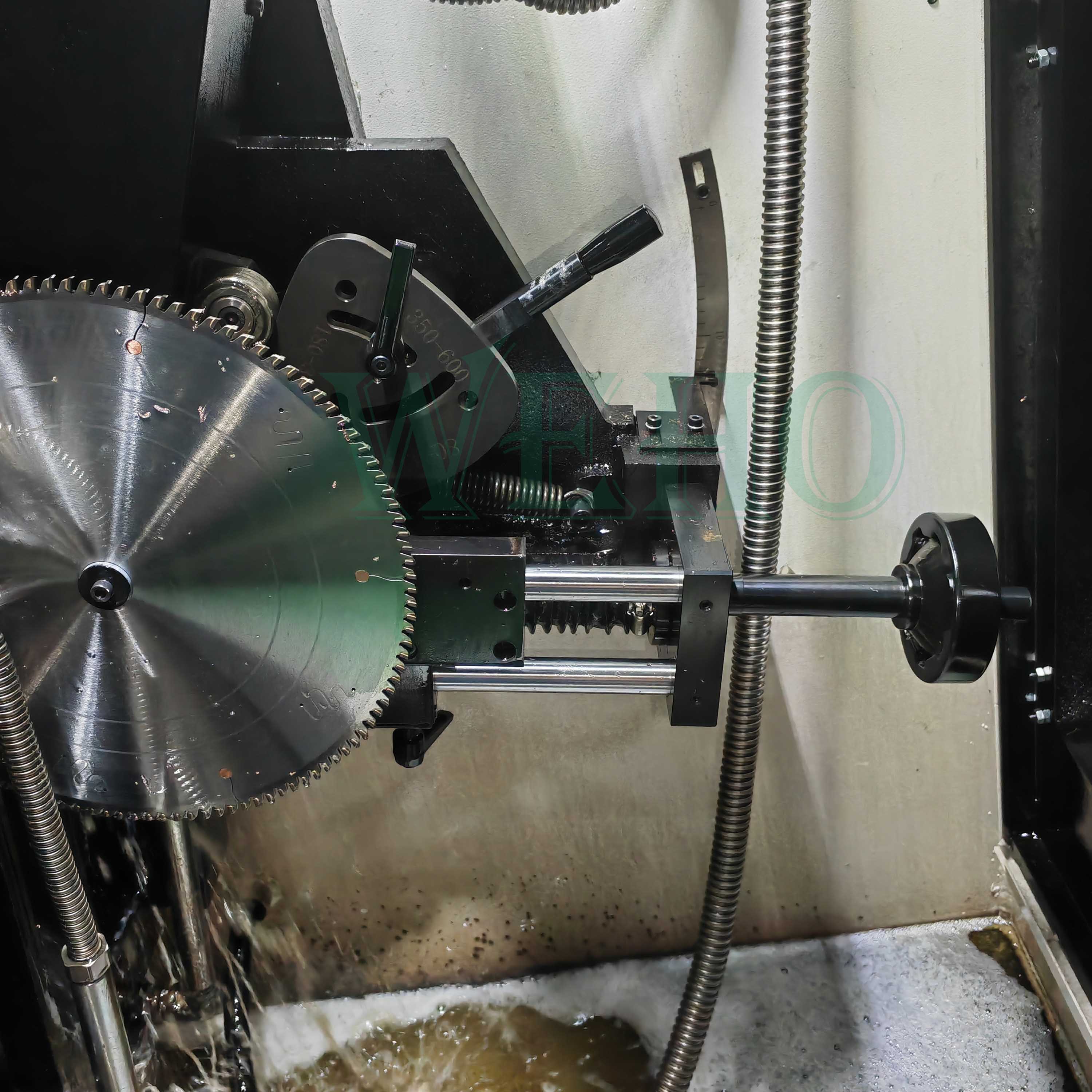 3. Manual/automatic sliding table expands the application space of the machine tool, which can not only process small saw blades, but also process large saw blades, realize the function of cutting in the turning process, and avoid short circuit of copper cutting.
