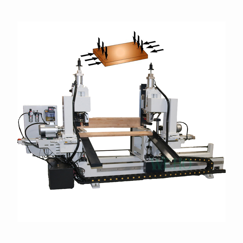 The machine has worktable, pressing device, vertical and horizontal drilling head which can install some pieces of the drilling bits, it can drill double end of wood from vertical and horizontal same time.