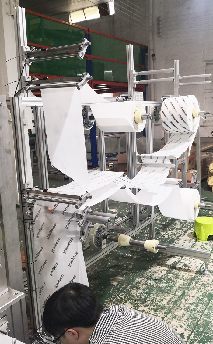 In order to achieve the perfect cooperation between the body machine and the ear belt welding machine, one body machine needs to be matched with two or three ear belt welding machines. In the fully automatic integrated equipment, generally one mask body machine is also connected with two or three ear belt welding machines.