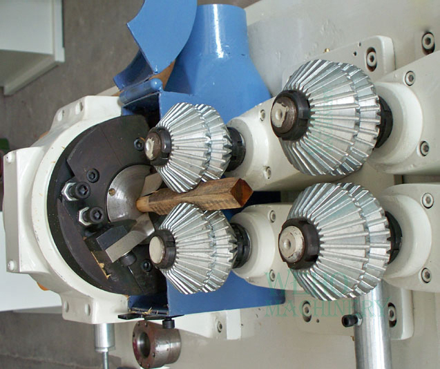 Feeding wheels has differnt installing type for different diameter rod. wood Round stick milling machine, produce broom, with round rod cutter.